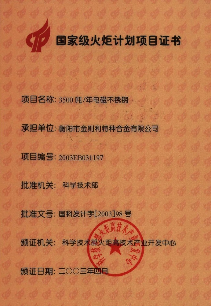 國家級火炬計(jì)劃項(xiàng)目證書 |